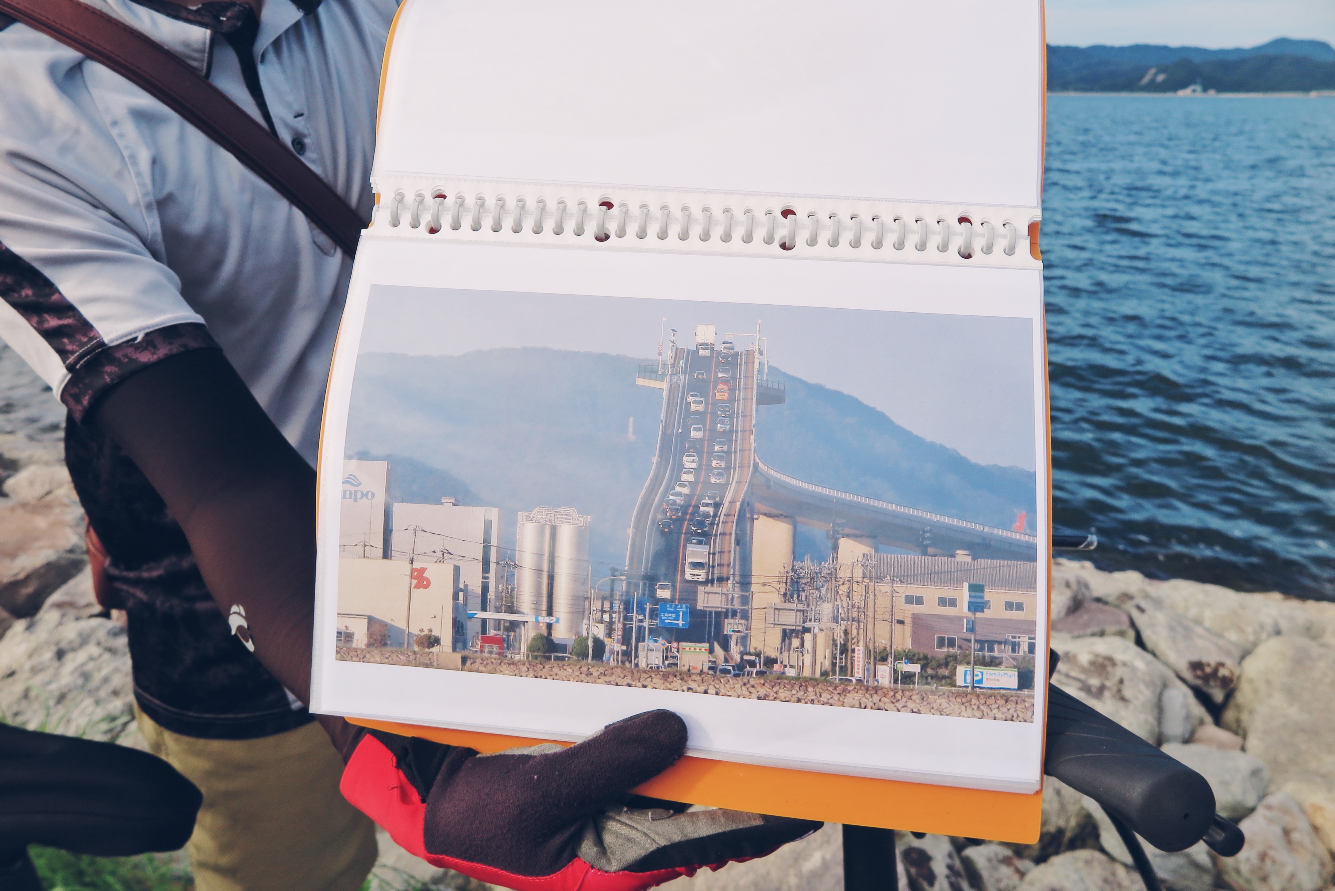 唯獨有一段是我不敢騎的,那便是江島大橋,在大根島時我們便遠眺了這座大名鼎鼎的江島大橋,有名的原因正是它的陡度在視覺的壓縮下,簡直像是雲霄飛車。